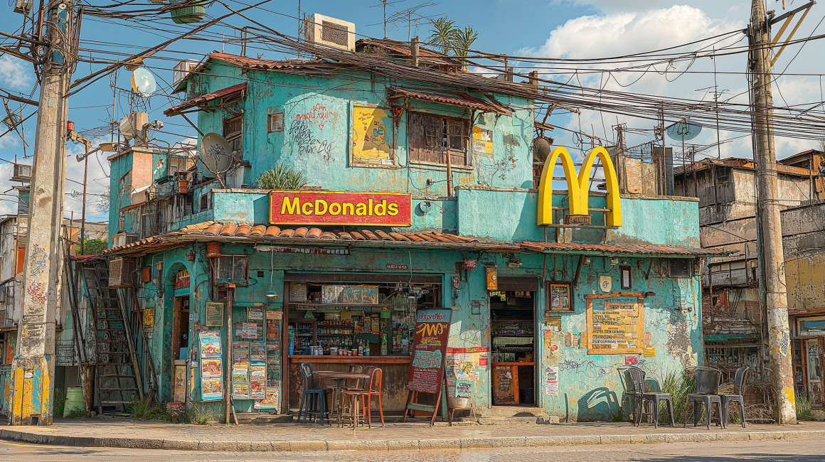O McDonald’s, símbolo global, reimaginado como se fosse apenas mais um comércio de esquina.