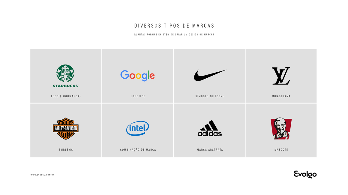 Símbolo ou Ícone: Estes são puramente gráficos e podem se tornar ícones culturais. O “swoosh” da Nike é um símbolo globalmente reconhecido, representando movimento e precisão.